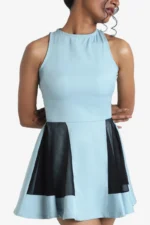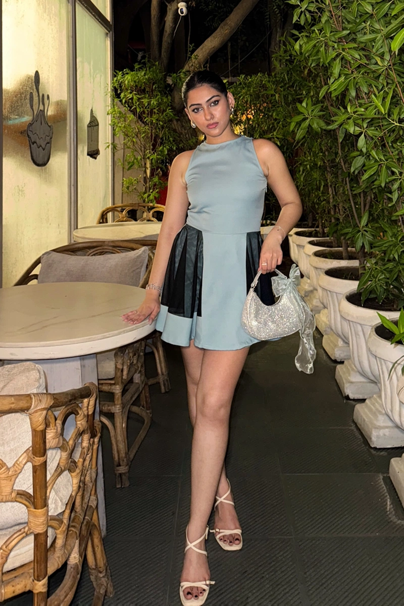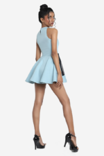 A mini dress with a halter neck and a flared skirt paired with mesh. Perfect for date nights or making a statement on your birthday.