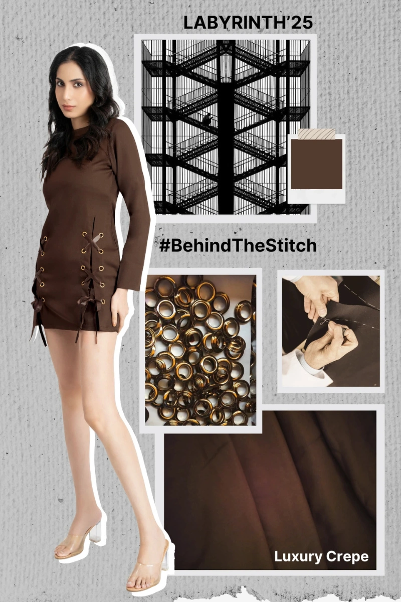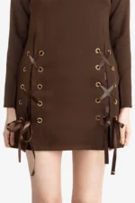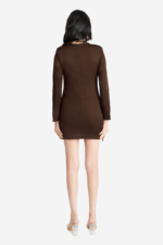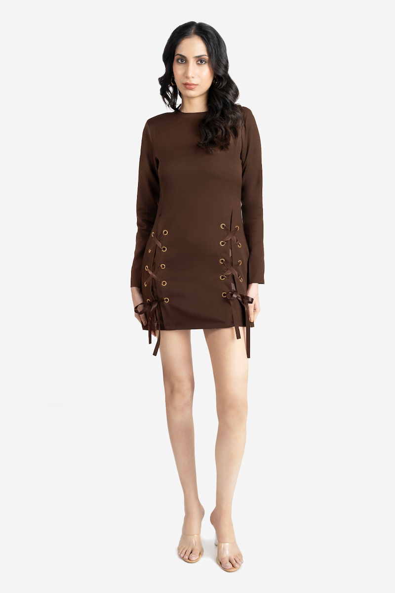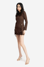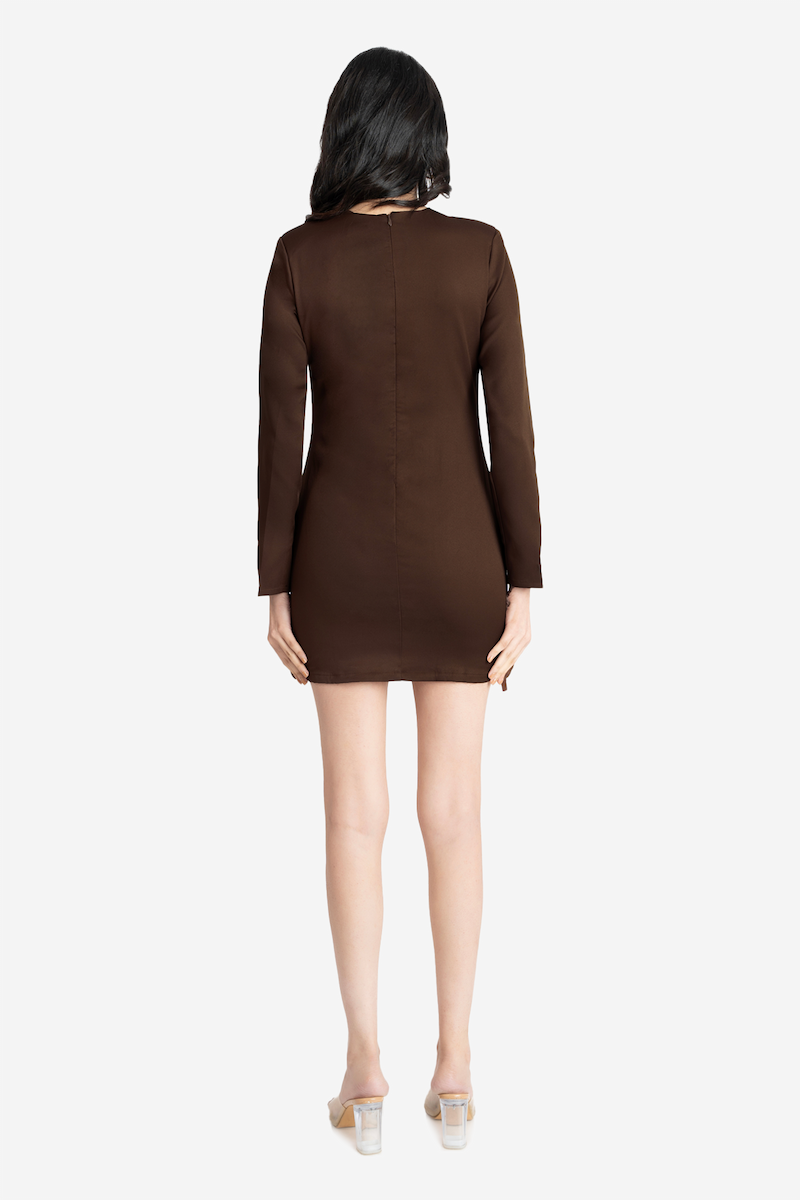 A chocolate brown mini dress with shoulder pads, full sleeves and satin ribbons. Perfect for party and clubbing.
