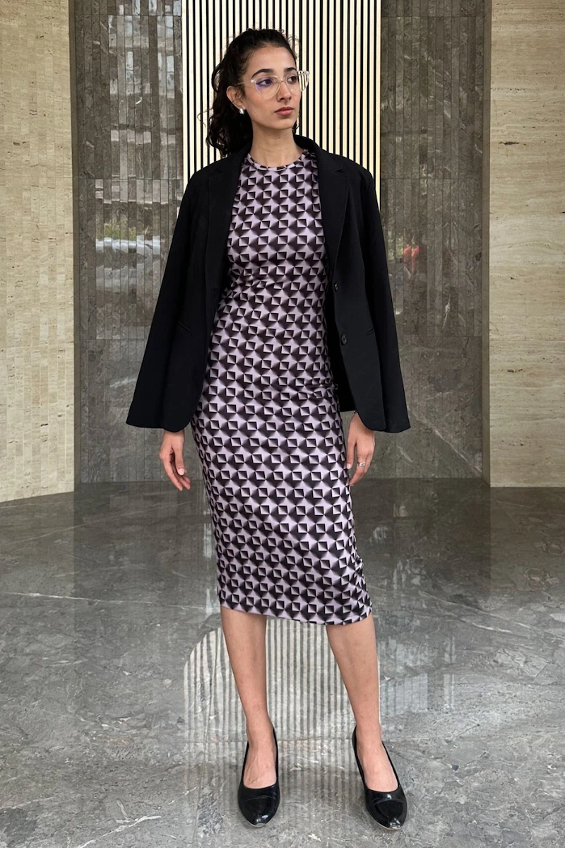 A bodycon midi dress with our signature print. Can be styled for work or streetwear.