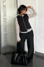 A sleeveless top featuring asymmetrical neckline and hemline, accentuated with white piping. Ideal for daily office wear.